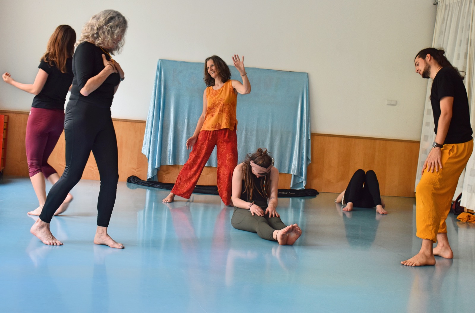 Viele Menschen tanzen die 5 Rhythmen in einer Turnhalle – hier meditativ in Stillness