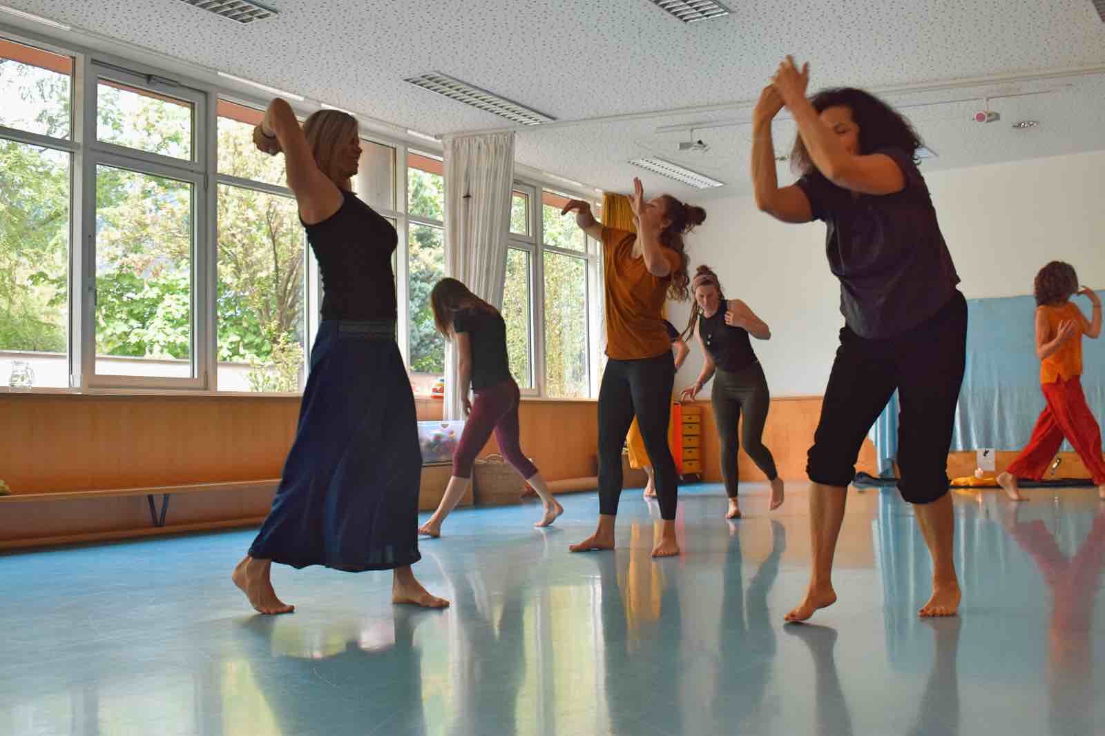 Viele Menschen tanzen die 5 Rhythmen in einer Turnhalle