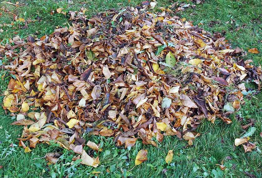 Garten im November, Herbst, Laubhaufen für Igel zusammen rechen